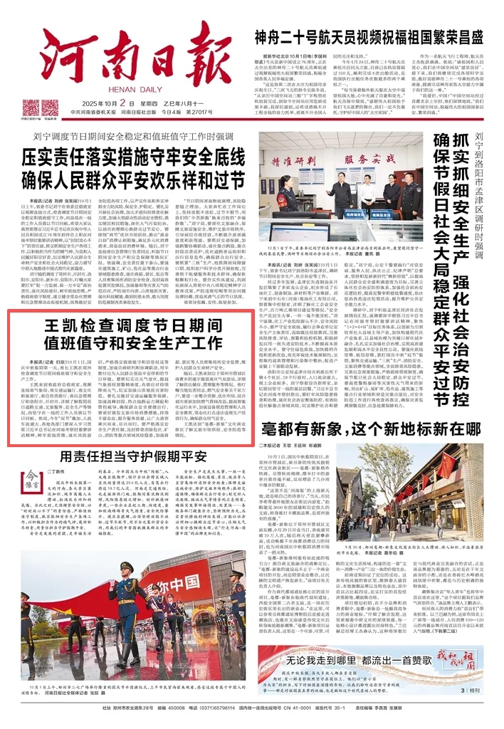 王凱來到省政府總值班室,視頻連線省氣象局、省交通運輸廳、省文化和旅游廳、省自然資源廳、省應(yīng)急管理廳和洛陽市、開封市,詳細了解假期首日道路交通、文旅服務(wù)、安全生產(chǎn)等情況,向堅守在一線的工作人員致以節(jié)日問候。他說,今年“雙節(jié)”疊加,人流車流量大,各地各部門要深入學(xué)習(xí)貫徹習(xí)近平總書記在河南考察時重要講話精神,樹牢底線思維,強化風(fēng)險意識,嚴格落實值班值守和信息報送等制度,加強會商研判和協(xié)調(diào)聯(lián)動,用辛勤付出為人民群眾創(chuàng)造平安祥和的節(jié)日環(huán)境。要密切關(guān)注天氣變化,提高氣象預(yù)報預(yù)警精準度,有效應(yīng)對持續(xù)降雨天氣,切實加強山洪地質(zhì)災(zāi)害防范。要扎實做好交通運輸服務(wù)保障,加強高峰時段、熱點線路運力調(diào)配和管控疏導(dǎo),確保群眾安全便捷出行。要更好激發(fā)文旅市場消費潛能,持續(xù)豐富業(yè)態(tài),提升服務(wù)質(zhì)量,讓廣大游客乘興而來、盡興而歸。要嚴格落實安全生產(chǎn)責(zé)任制,及時排查消除?;⒌V山、消防等重點領(lǐng)域風(fēng)險隱患,加強商超、景區(qū)等人員密集場所安全監(jiān)管,維護人民群眾生命財產(chǎn)安全。